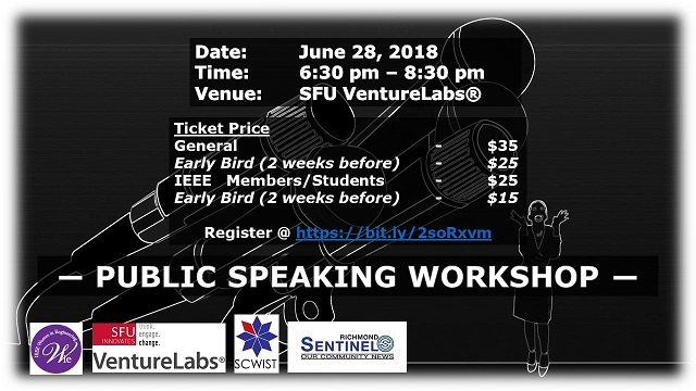 Join seasoned journalist, Lorraine Graves of The Richmond Sentinel and Society for Canadian Women in Science and Technology (SCWIST), and experienced distinguished Communication instructor, Katherine Golder of British Columbia Institute of Technology (BCIT) for a session of professional self-improvement on your public speaking skills.