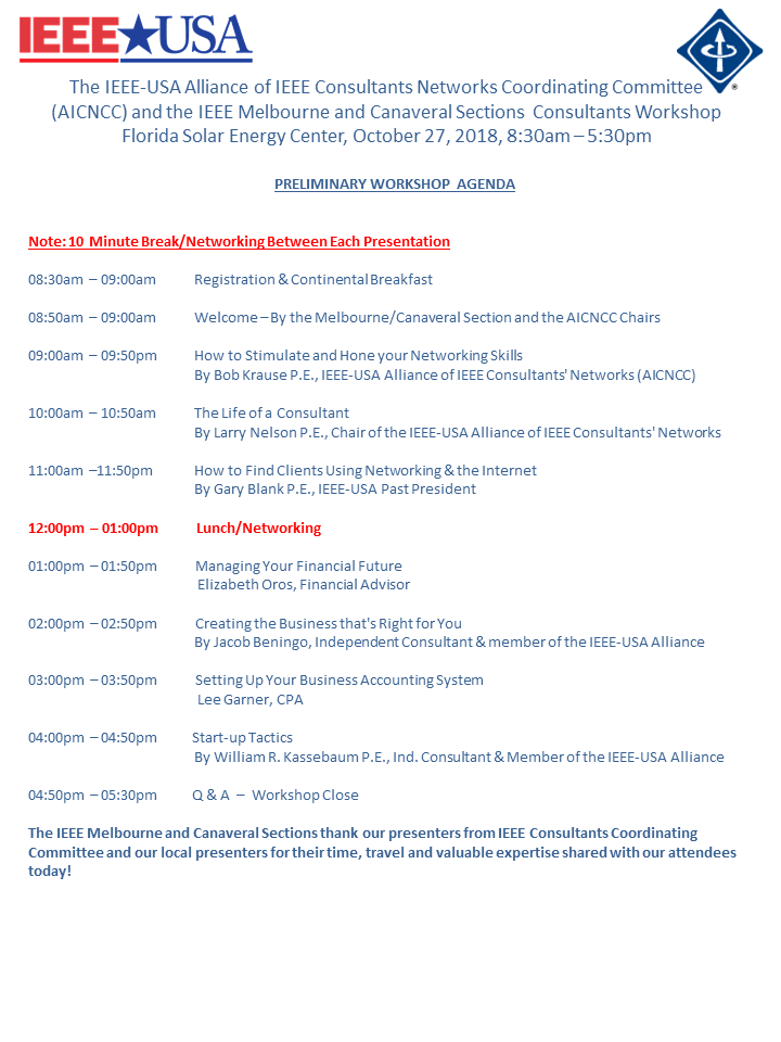 The IEEE-USA Alliance of IEEE Consultants Networks Coordinating Committee (AICNCC) and the IEEE Melbourne and Canaveral Sections invite you to attend a full day Workshop that will cover a range of topics on consulting. This Consultants Workshop event is designed for those who are considering consulting as a professional option – either now or in the future and practicing consultants who want to improve their networking and marketing skills.