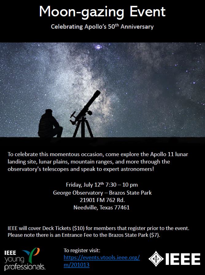 This year marks 50 years since humankind first landed on the moon. To celebrate this momentous occasion, the IEEE Houston Section & IEEE Houston Young Professionals invites all members to attend the George Observatory's Moon-gazing event.