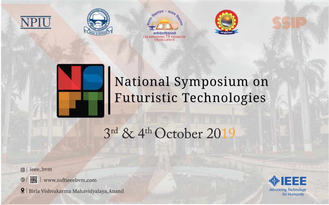 It gives us great pleasure to announce that the IEEE BVM SB had organized the "National Symposium on Futuristic Technologies (NSFT’19)”. The symposium was held at the Birla Vishvakarma Mahavidyalaya Engineering College, Anand, Gujarat, India on 3rd and 4th October 2019. The symposium’s theme was on delivering advanced knowledge for the futuristic technologies in different engineering domains.