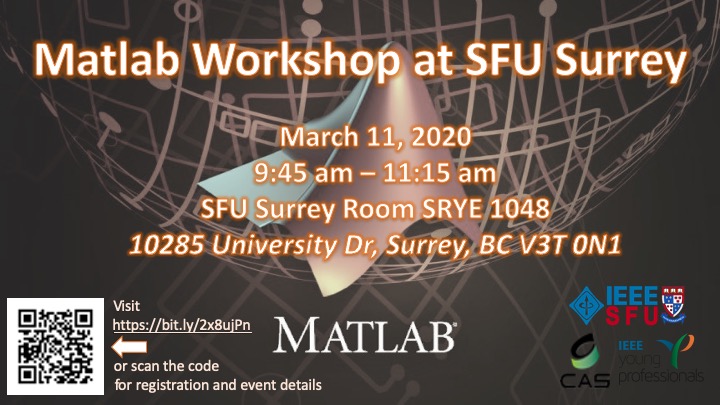 The IEEE SFU Student Branch, Young Professionals, and Circuits and Systems Society will be hosting a Matlab Workshop at SFU School of Sustainable Energy Engineering: "MATLAB for Excel Users"