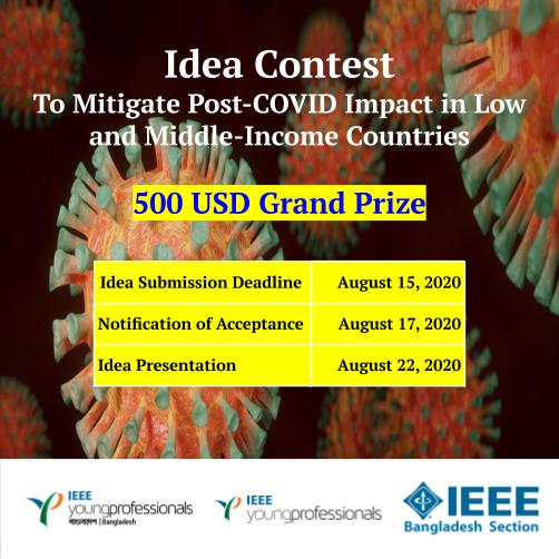 IEEE Young Professionals Bangladesh is organizing an idea contest that leverages the technical skills of IEEE YP members and promotes humanitarian activities by seeking ideas to minimize the socio-economic impacts after COVID-19 sponsored by IEEE Young Professionals.