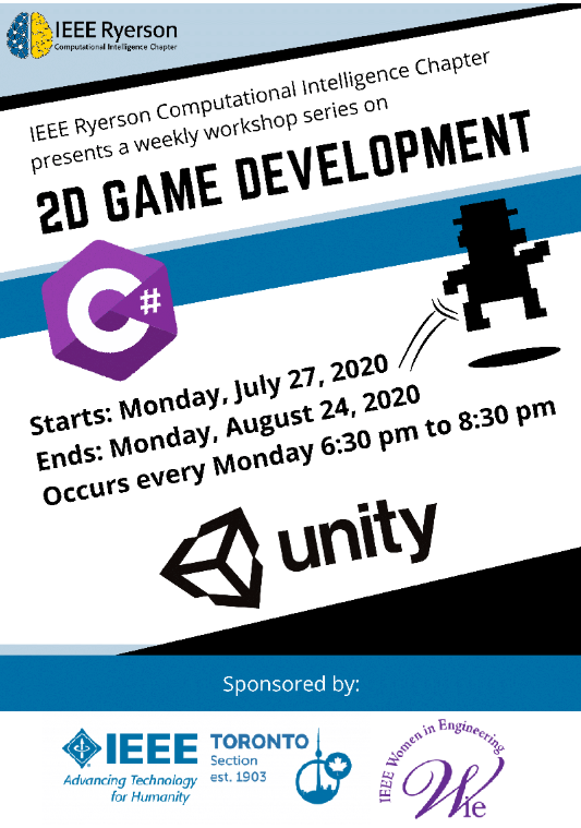 Our interactive workshop welcomes new and experienced programmers who are interested in 2D game development. This event hosted by IEEE Ryerson Computational Intelligence Chapter is sponsored by IEEE WIE and will provide the building blocks and best practices in developing a 2D level game including, creating a player, creating enemies, game loops, animations, and more! All who attend all five sessions will get a certificate from IEEE WIE and can submit their 2D game into a friendly competition with small prizes at the end of the workshop series.