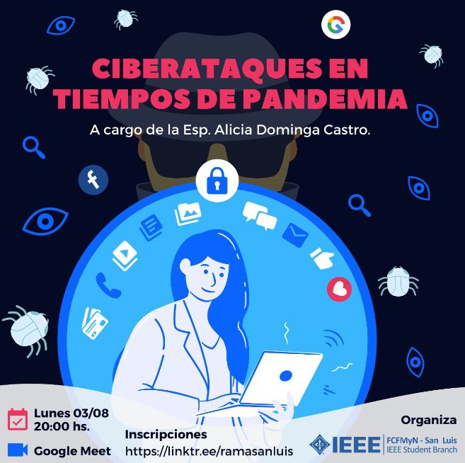 En esta charla de capacitación y concientización la Esp. Alicia Dominga Castro puede dar consejos de cómo cuidar la información o el equipo, contar sobre los ciberataques en distintos ambientes y darnos herramientas de protección para evitar que alteren nuestras actividades digitales.