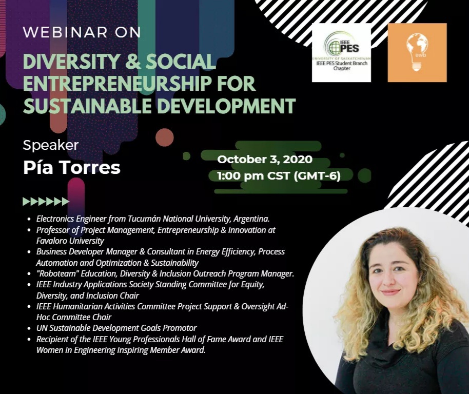 Pía Torres is an Electronics Engineer from Tucumán National University, Argentina. She is a Professor of Project Management, Entrepreneurship & Innovation at Favaloro University. She is a Business Developer Manager & Consultant in Energy Efficiency, Process Automation and Optimization & Sustainability. Pía is the "Roboteam" Education, Diversity & Inclusion Outreach Program Manager. She is also currently serving as IEEE Industry Applications Society Standing Committee for Equity, Diversity, and Inclusion Chair and as IEEE Humanitarian Activities Committee Project Support & Oversight Ad-Hoc Committee Chair. She is an international speaker and the United Nations Sustainable Development Goals Promotor. Pía is the recipient of several awards, including the IEEE Young Professionals Hall of Fame Award and IEEE Women in Engineering Inspiring Member Award.