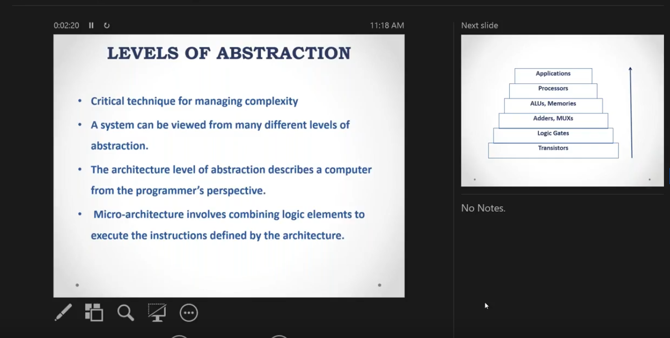 2. Next, the speaker moved on to the explanation of the levels of abstraction included in digital design, and spoke about programs, device drivers, instruction registers, datapaths controllers, adders, memories, AND and NOT gates, Amplifiers, Filters, Transistors, Diodes and the role of electrons.