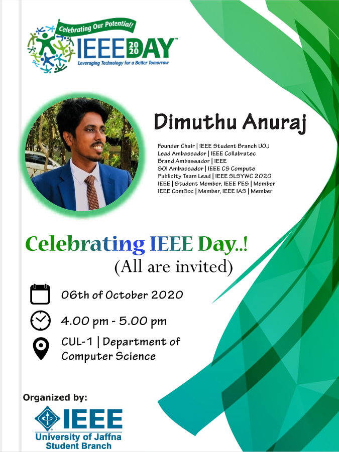 Join with us to Celebrate IEEE Day, this event is all about the introduction and benefits of IEEE which is the world's largest technical professional organization dedicated to advancing technology for the benefit of humanity. The guest speaker of the event is Mr Dimuthu Anuraj, Founder Chair of the University of Jaffna IEEE Student Branch.