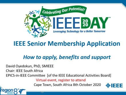 This workshop covers the benefits of IEEE Senior membership, how to prepare an application and support available from IEEE South Africa Section.