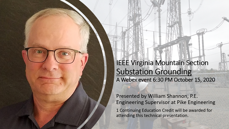 Bill Shannon from Pike Engineering in Roanoke, VA will present on the topic of substation grounding at the next regular meeting of the IEEE Virginia Mountain Section. This will be presented on Webex Thursday, October 15 at 6:30. Watch your email or contact robert.l.kern@ieee.org for the meeting link.
