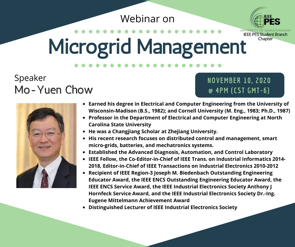 Mo-Yuen Chow earned his degree in Electrical and Computer Engineering from the University of Wisconsin-Madison (B.S., 1982); and Cornell University (M. Eng., 1983; Ph.D., 1987). Dr. Chow is a Professor in the Department of Electrical and Computer Engineering at North Carolina State University. He was a Changjiang Scholar.