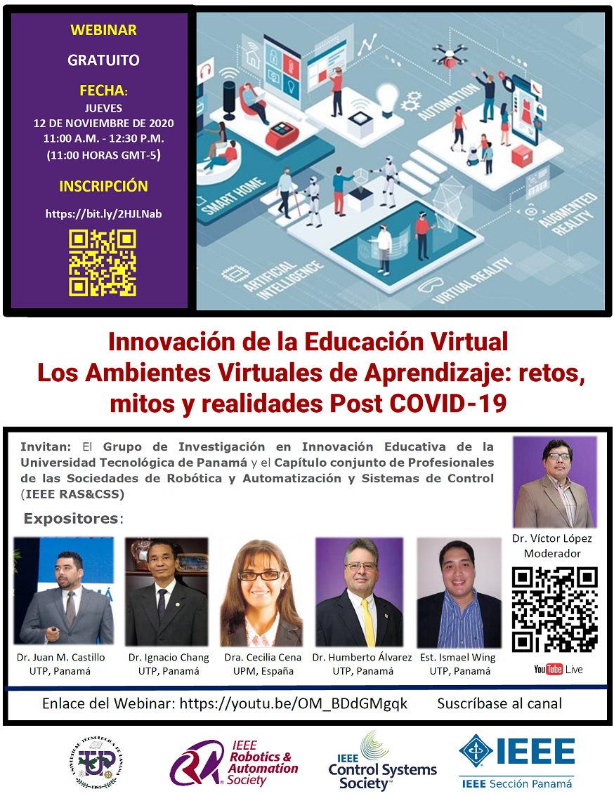 El Grupo de Investigación en Innovación Educativa de la Universidad Tecnológica de Panamá y el Capítulo conjunto de Profesionales de las Sociedades de Robótica y Automatización y Sistemas de Control (IEEE RAS&CSS) placer de invitarles al Webinar “Innovación de la Educación Virtual - Los Ambientes Virtuales de Aprendizaje: restos, mitos y realidades Post COVID-19”.