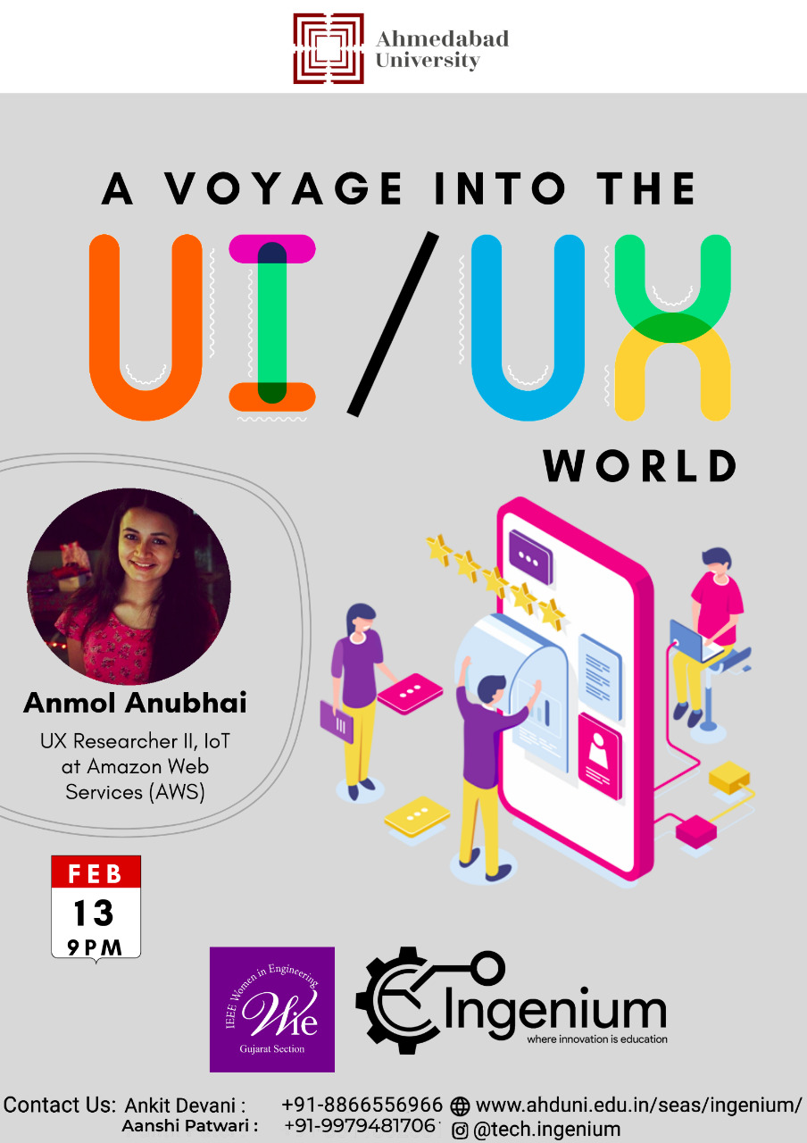 The WIE Affinity group of Ahmedabad University IEEE SB is organizing a technical talk on: "A Voyage into the UI/UX World". This will be a kickstart to our annual tech fest Ingenium, and the talk will focus on the importance of a good interface, fundamentals of interface design, and some interesting career opportunities in the UI/UX world.