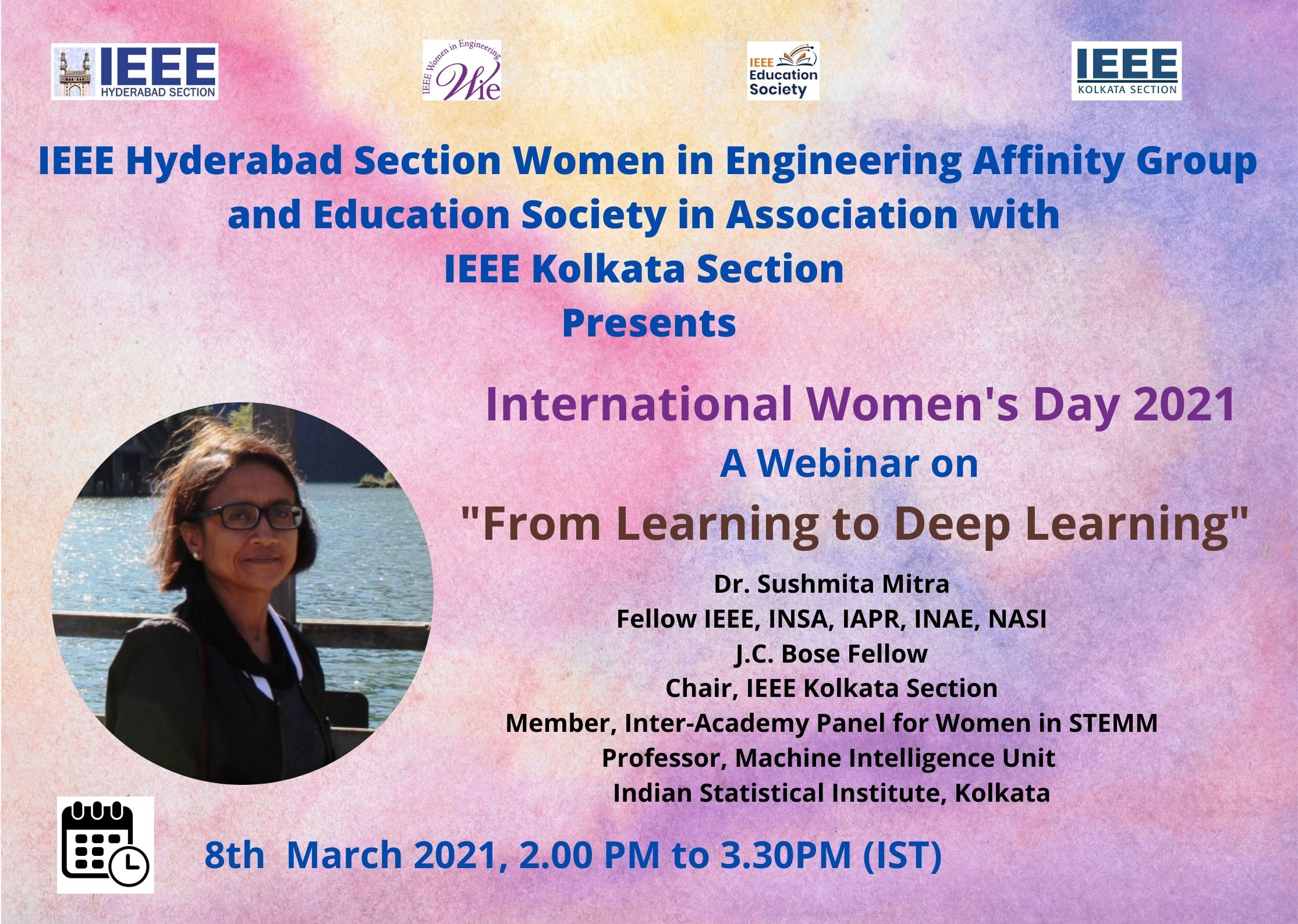IEEE Hyderabad Section WIE AG and Education Society in association with IEEE Kolkata Section is coming up with a webinar on the occasion of International Women's Day titled “From Learning to Deep Learning”
