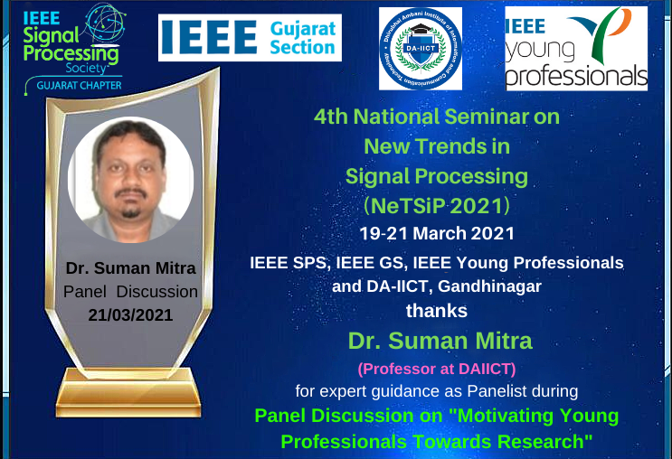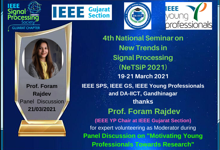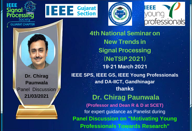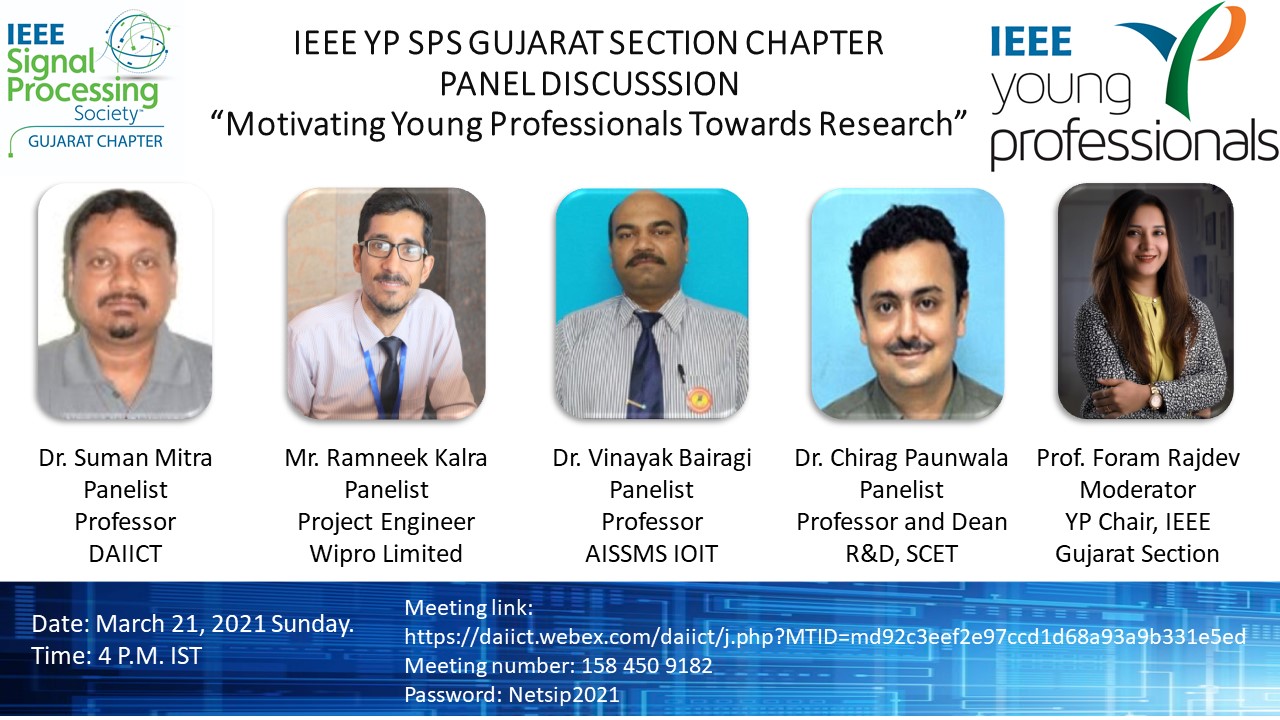 IEEE Young Professionals and IEEE Signal Processing Society Gujarat Section Chapter is organizing panel discussion (online Mode) on " Motivating Young Professionals towards Research " on 21th March 2021 4 P.M. to 5 P.M. IST.