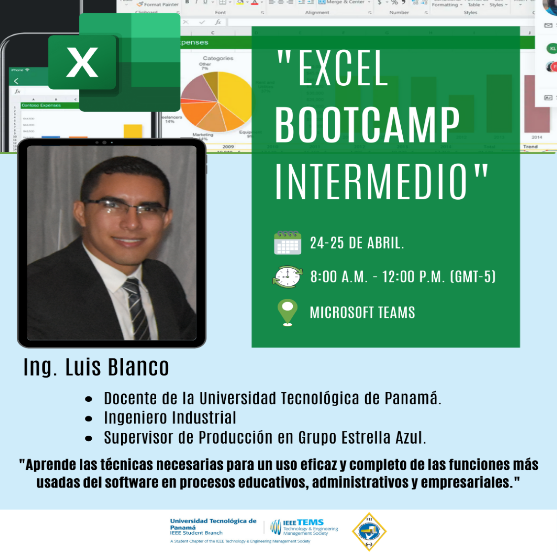 El capítulo estudiantil TEMS de la rama IEEE de la Universidad Tecnológica de Panamá, tiene el agrado de invitarles a nuestra primera capacitación del año “Excel Bootcamp Intermedio”.