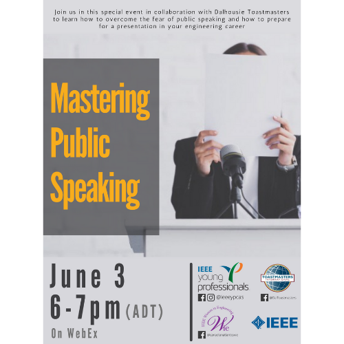 Public speaking can often be intimidating and technical presentations can be difficult to prepare and perform. Join us in this special event in collaboration with Dalhousie Toastmasters to learn how to overcome the fear of public speaking and how to prepare for a presentation in your engineering career.