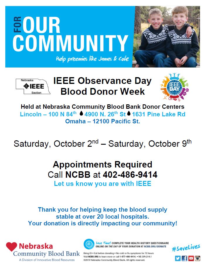 Header - Celebrate IEEE Day with a Blood Drive. Join the Nebraska Section and IAS Society in donating blood to the Nebraska Community Blood Bank.