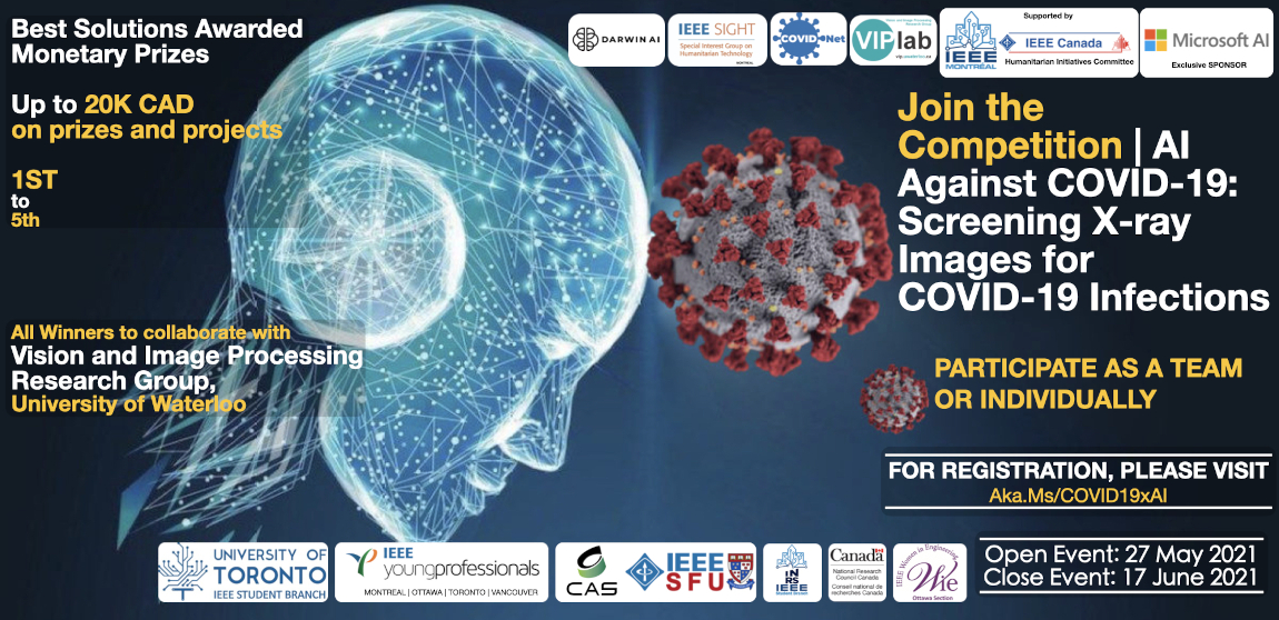 IEEE SIGHT (Special Interest Group on Humanitarian Technology) of Montreal Section, Vision and Image Processing Research Group of the University of Waterloo and DarwinAI Corp. invite you to the closing ceremony of the virtual competition on AI for COVID-19 diagnosis with chest X-ray images. In the First Phase, the challenge consisted of designing robust machine learning algorithms to predict if the subjects of study are either COVID-19 positive or COVID-19 negative. Join us to celebrate the amazing work done by all the teams and know who will be participating in the Second Phase. Then, you are also invited to a networking session with everybody!