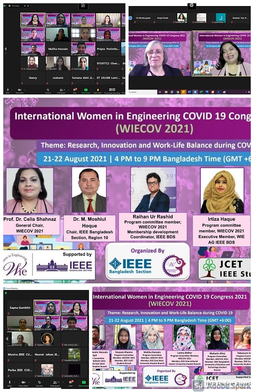 IEEE Bangladesh section offers successful events for the whole section by collaborating with different national and international IEEE sections, affinity groups, student branches etc. Recently IEEE Bangladesh Section and Women In Engineering Affinity Group of IEEE Bangladesh Section have organised an event named “Women In Engineering Covid 19 Congress 2021” (WIECOV 2021) with the help of the Women In Engineering Affinity Group of IEEE Bangalore Section. This successful event was totally a virtual event that went live on 21st and 22nd August 2021, starting the session at sharp 4.00 PM GMT+6 and lasting till 9.00 PM GMT+6.
