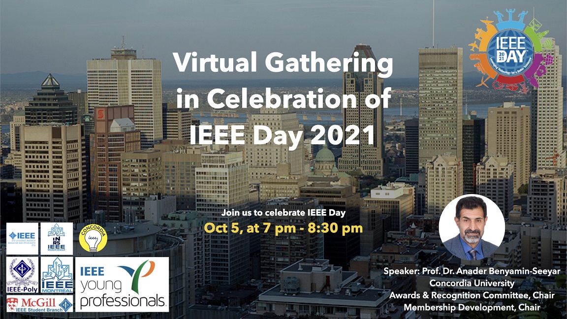 The IEEE Young Professionals (YP) Montreal Section jointly with the IEEE Student branches of Montreal Section organized and led the IEEE Day 2021 celebration in collaboration with the IEEE Montreal section. The event provided the opportunity to the attendees to get more familiar with the IEEE organization through the speech delivered by past members of the IEEE Montreal Section. The event will also cover the activities of the IEEE Student Branches (SBs) along with the events organized by the IEEE YP Montreal Section.