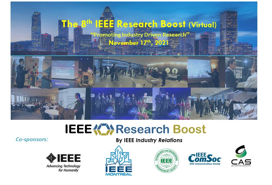 IEEE Montreal Section and IEEE Montreal Industry Relations Committee are very pleased to invite you to attend the 8th edition of IEEE Research Boost event that will be held ONLINE, on November 17th, 2021, 6:00 PM - 9:00 PM. The event aims to foster collaborative research projects and networking among the industry, government and academia. It is an evening event during which invited experts and leaders from the industry, government and academia present some of the state-of-the-art innovations in their field of expertise.