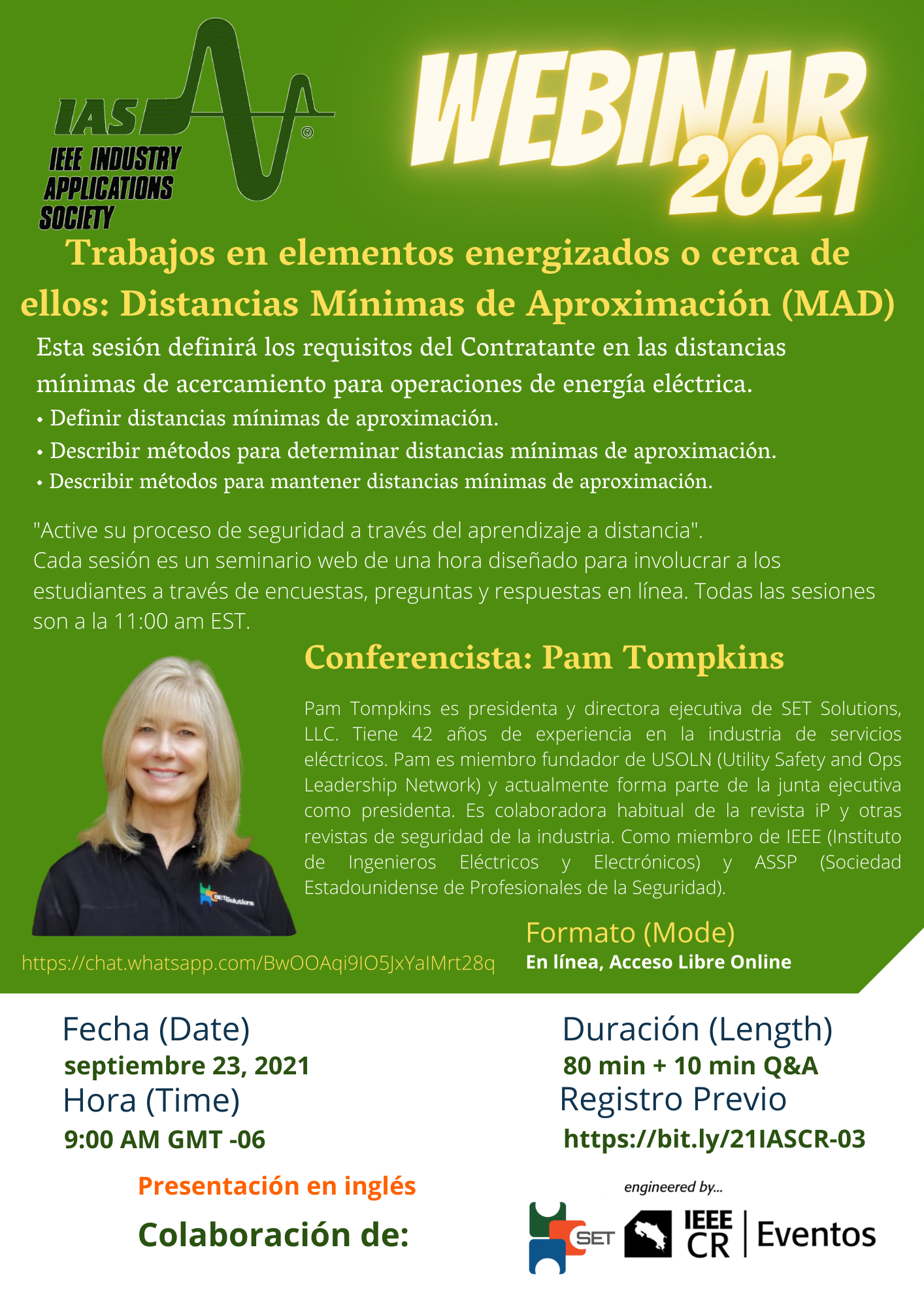 Pam Tompkins es presidenta y directora ejecutiva de SET Solutions, LLC. Tiene 42 años de experiencia en la industria de servicios eléctricos. Pam es miembro fundador de USOLN (Utility Safety and Ops Leadership Network) y actualmente forma parte de la junta ejecutiva como presidenta. Es colaboradora habitual de la revista iP y otras revistas de seguridad de la industria. Como miembro de IEEE (Instituto de Ingenieros Eléctricos y Electrónicos) y ASSP (Sociedad Estadounidense de Profesionales de la Seguridad).