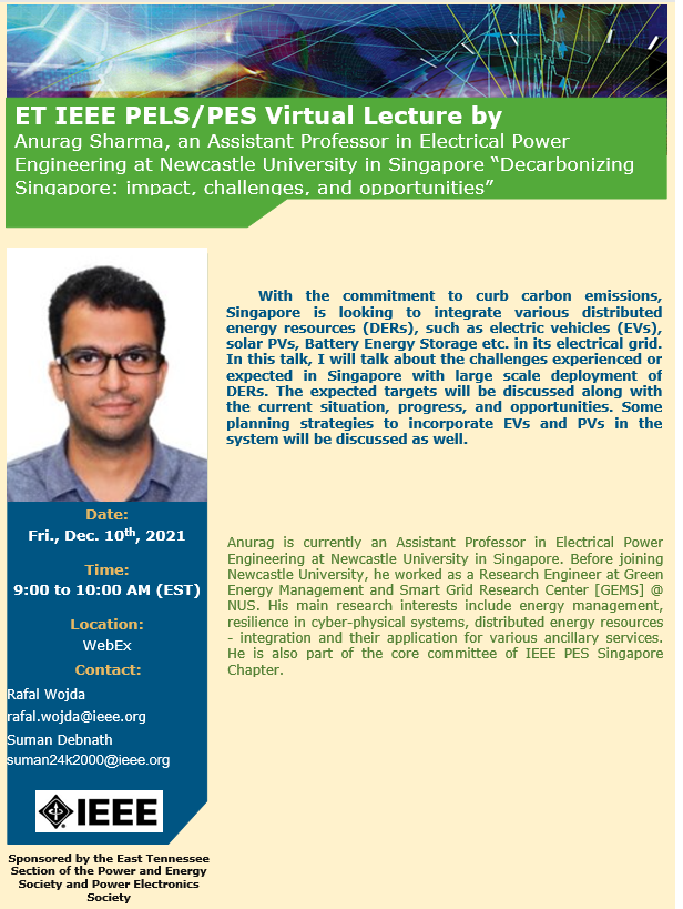 With the commitment to curb carbon emissions, Singapore is looking to integrate various distributed energy resources (DERs), such as electric vehicles (EVs), solar PVs, Battery Energy Storage etc. in its electrical grid. In this talk, I will talk about the challenges experienced or expected in Singapore with large scale deployment of DERs. The expected targets will be discussed along with the current situation, progress, and opportunities. Some planning strategies to incorporate EVs and PVs in the system will be discussed as well.
