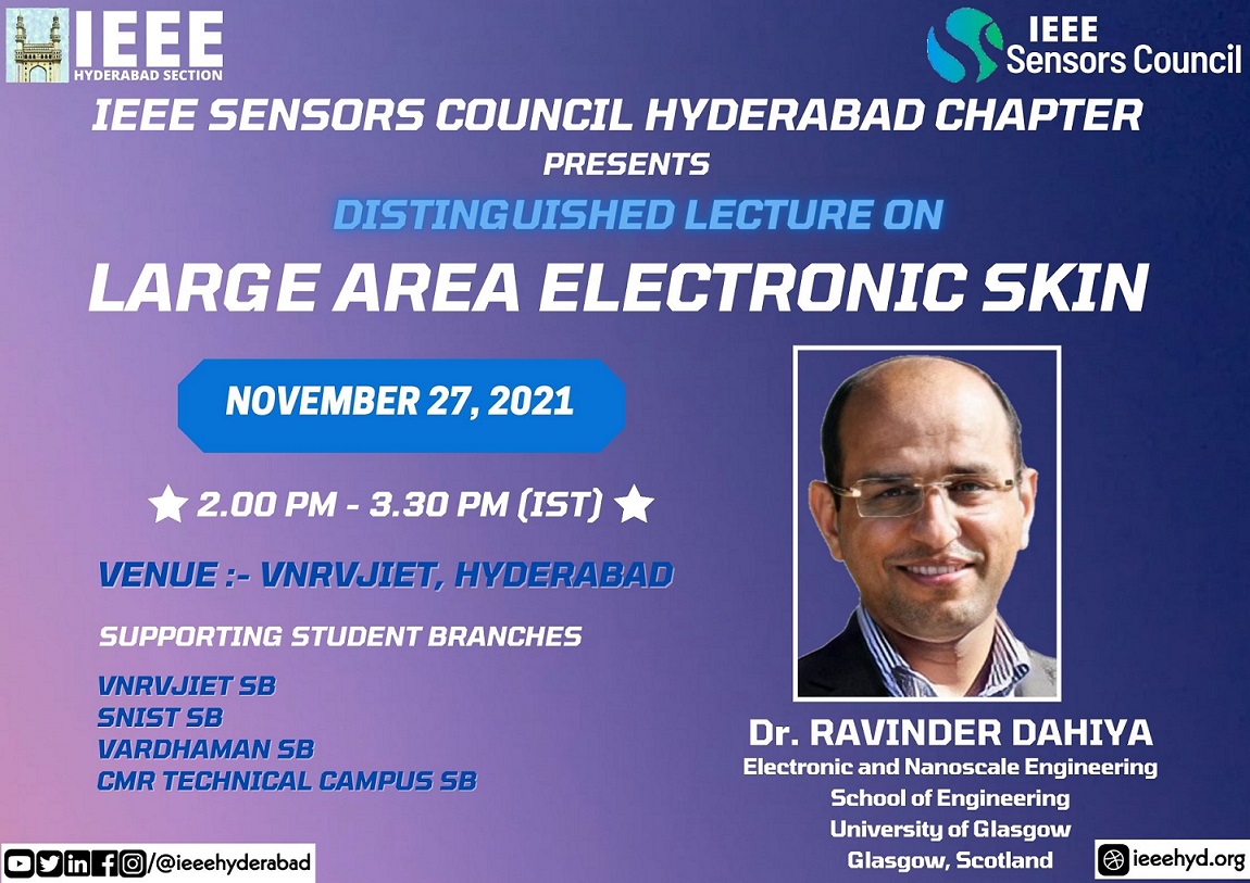 IEEE Hyderabad Section Sensors Council Chapter is organizing a Distinguished Lecture titled “Large Area Electronic Skin” as recent advances in the field, pursued through “More than Moore” technology, are propelled by burgeoning fields such as wearable systems, bendable displays, and biomedical applications on 27th Nov 2021 from 2.00 PM to 4.00 PM (IST)