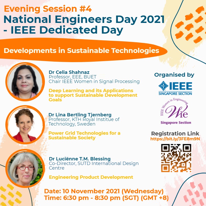 The IEEE Singapore Section is organizing a dedicated day under the 12th edition of the National Engineers Day (NED) 2021 – Singapore's largest engineering festival organized for students, engineering professionals, and the public. This is a full-day virtual event in focus on Advancing Technology for Humanity in the "New Normal". As a part of this event, the IEEE Women in Engineering (WiE) in Singapore affinity group will host a networking session under the topic (a breakout session 4) titled "Developments in Sustainable Technologies."