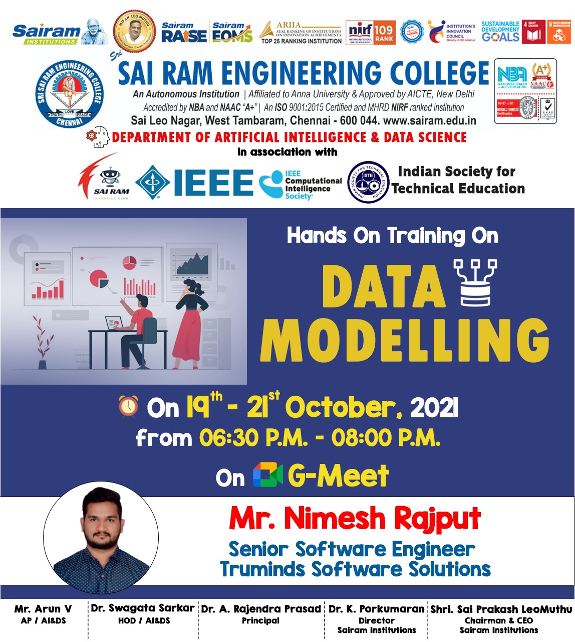 The IEEE SB CIS Society & AI&DS department organized Hands On Training on DATA MODELLING from 19th -21st October for the students of AI-DS Department through Online Mode (GMEET). Mr. Nimesh Rajput and Mr. Sanjay Hotwani were the main Lectures for the training. Mr Nimesh is a Senior Software Engineer from Truminds Software Solutions who is very well knowledged person in the field of Machine Learning and Data Science. On first day of the training Assistant Professor of AI-DS Department Mr. Arun V Introduced the Lectures to the students then the lectures started their presentation on Introduction in Machine Learning and Data Science fully theory based and asked some question for which students answered at the end of the day.