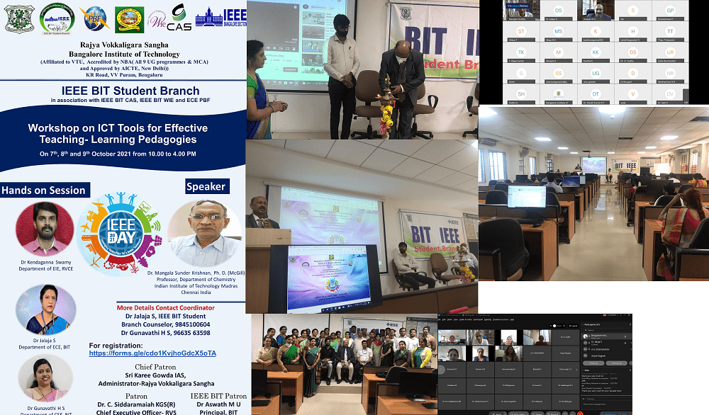 IEEE BIT Student Branch counselor in association with IEEE CAS BIT and Professional Bodies Forum Dept ECE, Bangalore Institute of Technology, Bangalore organized a 3-Days workshop on “ICT Tools for Effective Teaching- Learning Pedagogies” from 7th to 9th October 2021.