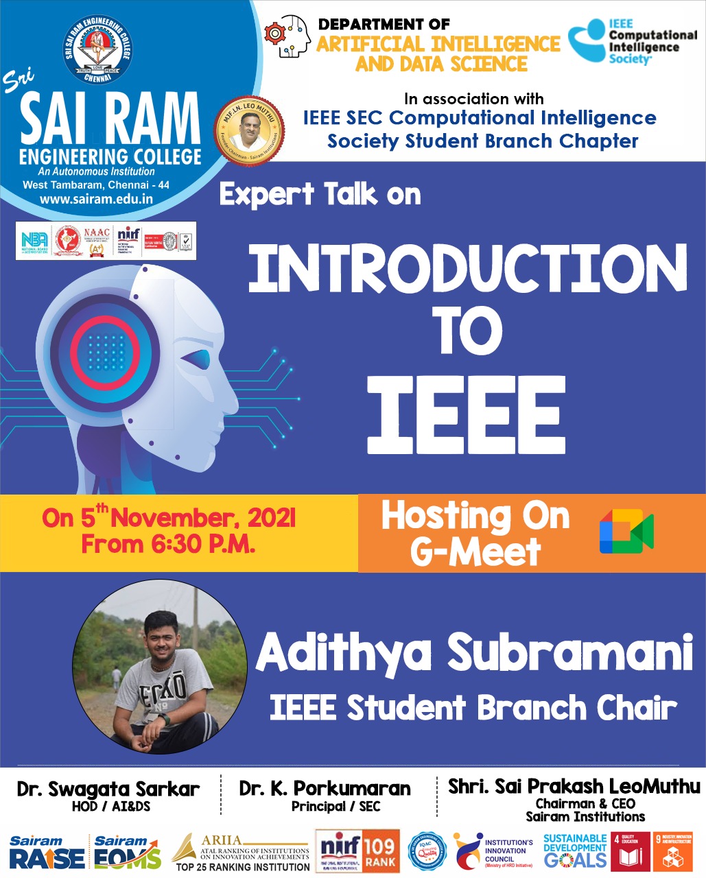 The Chief Guest for the event was Mr. Adithya Subramani. He has his own start-up company CTU of center and CEO of A.K.A IT service. He is also the IEEE student branch chairperson, the mastermind of Sai Ram IEEE, Sai Ram IEEE inspire head, photonic and nano Technology Council chair, IEEE educational activity committee lead, and Sai Ram student fraternity.