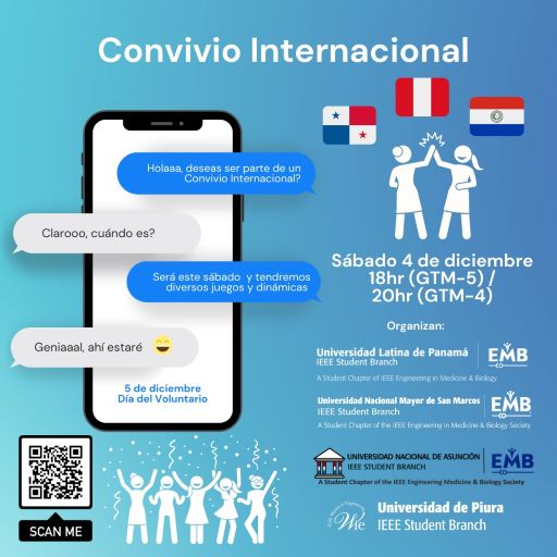 En el marco de la celebración del Día Internacional del Voluntario el Capítulo Técnico Estudiantil EMB de la Universidad Latina de Panamá, en alianza con EMB Universidad de San Marcos, EMB Universidad de Piura y EMB Universidad Nacional de Asunción, organizan la Primera Reunión Internacional de Convivencia Virtual entre Voluntarios de las Ramas Estudiantiles de IEEE en Latinoamérica como una oportunidad para conocer e interactuar con otros de los miembros del voluntariado de la región y compartir un divertido momento de forma colectiva.