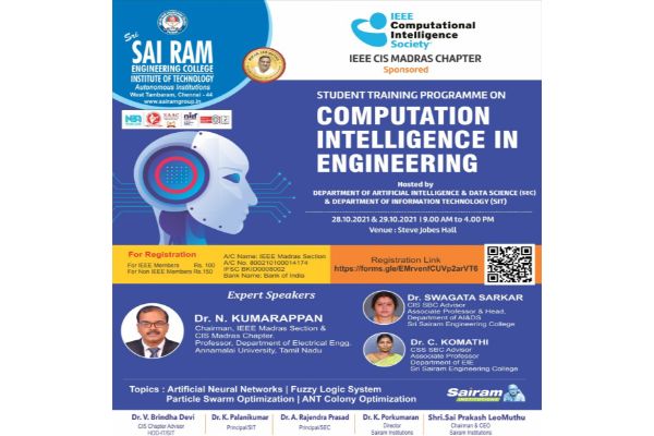 The IEEE CIS Madras Chapter Sponsored Student Training Program on “Computational Intelligence in Engineering” was hosted by Department of Artificial Intelligence and Data Science of Sai Ram Engineering College and Department of Information Technology of Sai Ram Institute Of Technology for two days that is on 28th and 29th October 2021. Dr. Swagata Sarkar and Dr. Komathi were the main lecturer of the program. IEEE CIS Madras Chapter Chairperson DR. N Kumarappan was the Chief Guest of the training Program.