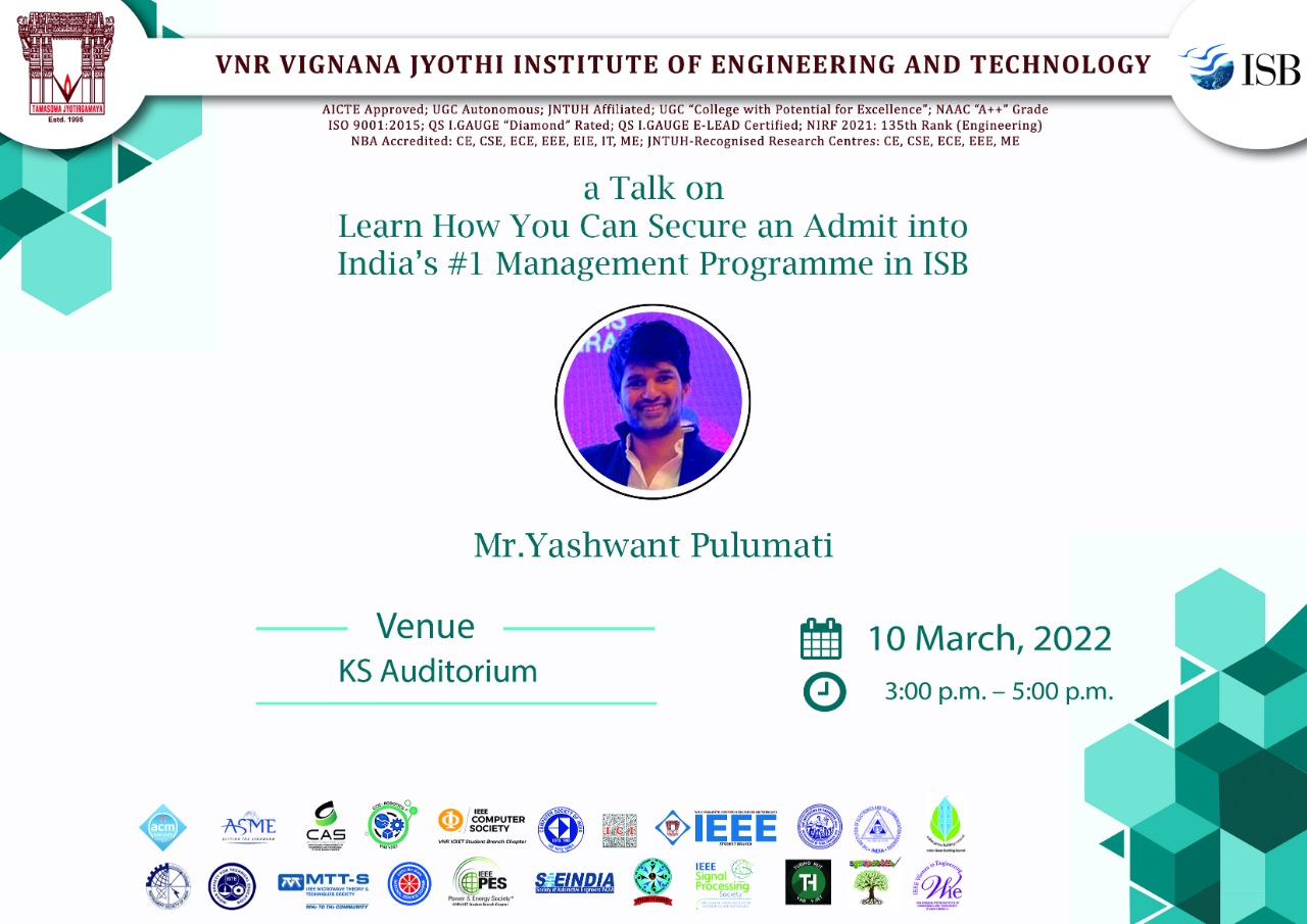 Learning that is synonymous with career acceleration - ISB India. Want to know how you can make your career move before you graduate? Here's a great opportunity to get to know how you can get admit into India's #1 Management programme in ISB India. All professional chapters of VNR Vignana Jyothi Institute of Engineering and Technology is organising a talk on Learn how you can secure an admit into India’s #1 Management Programme on 10th March, 2022