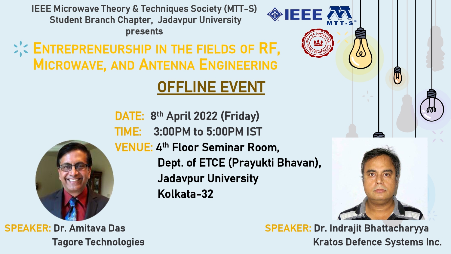 Entrepreneurship in the fields of RF, Microwave, and Antenna Engineering is an offline event that will take place in the 4th-floor seminar room of Jadavpur University on 8th April 2022 from 3 PM. Our two speakers, Dr. Indrajit Bhattacharyya and Dr. Amitava Das, will talk about the scopes, requirements, and challenges of RF, Microwave, and Antenna engineering in the industry today.