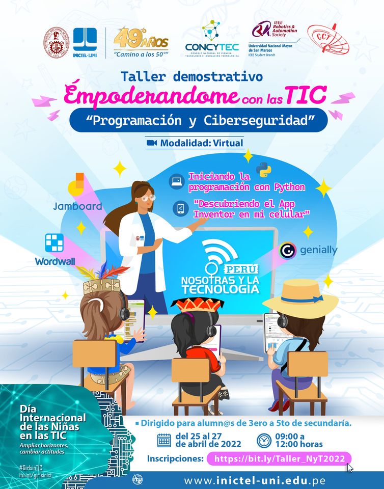 Te invitamos a participar del evento gratuito "Taller Demostrativo Émpoderandome con las TIC: Programación y Ciberseguridad”, actividad realizada en organización con el Concytec Perú y INICTEL-UNI , con objetivo es incentivar el interés por la #ciencia y #tecnología en niñas y adolescentes.
