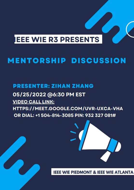 Join Zihan Zhang a PhD student in Industrial Engineering at Georgia Tech. She will be guiding a discussion about her experience with mentoring, everything she has learned so far and how you can also benefit from finding a good mentor and being a good mentee.