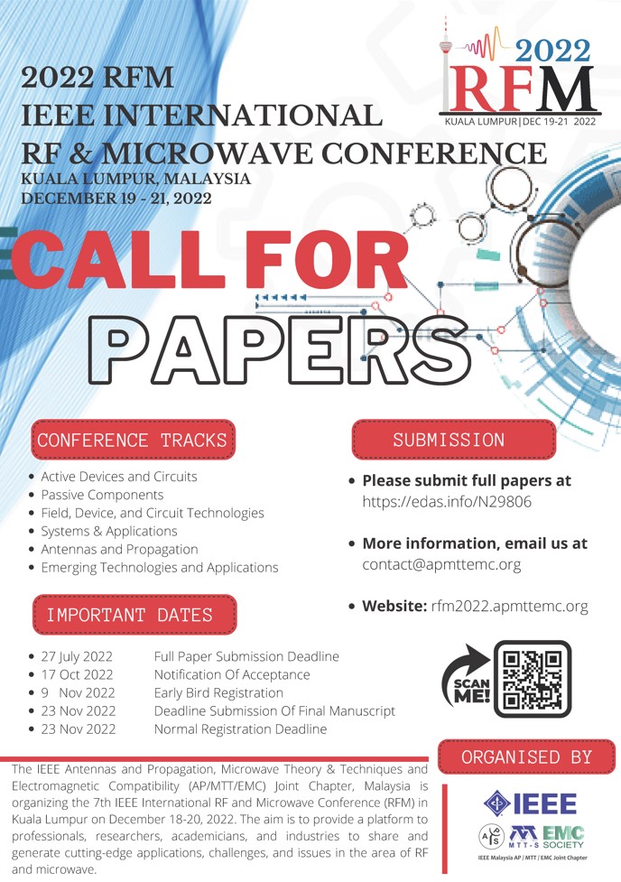 The RFM Conference series is back. This year, the 2022 IEEE International RF and Microwave Conference (RFM 2022) will be held in Kuala Lumpur, MALAYSIA, from DECEMBER 19 to 21, 2022 in a traditional on-site format. Since 2004, RFM has provided a consistent platform for researchers in the areas related to RF and Microwave technology to present their research results, while exchanging views and experiences.