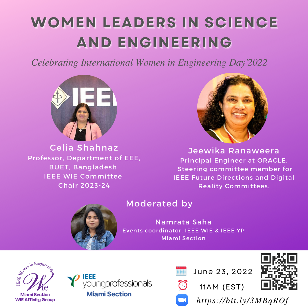 IEEE Women in Engineering (WIE) and IEEE Young Professionals (YP) Miami Section Affinity Groups are going to host a WIE Panel Discussion Event titled “Women Leaders in Science and Engineering” on June 23th at 10.00 AM (EST). We are delighted to have Dr. Jeewika Ranaweera and Dr. Celia Shahnaz as our speakers.