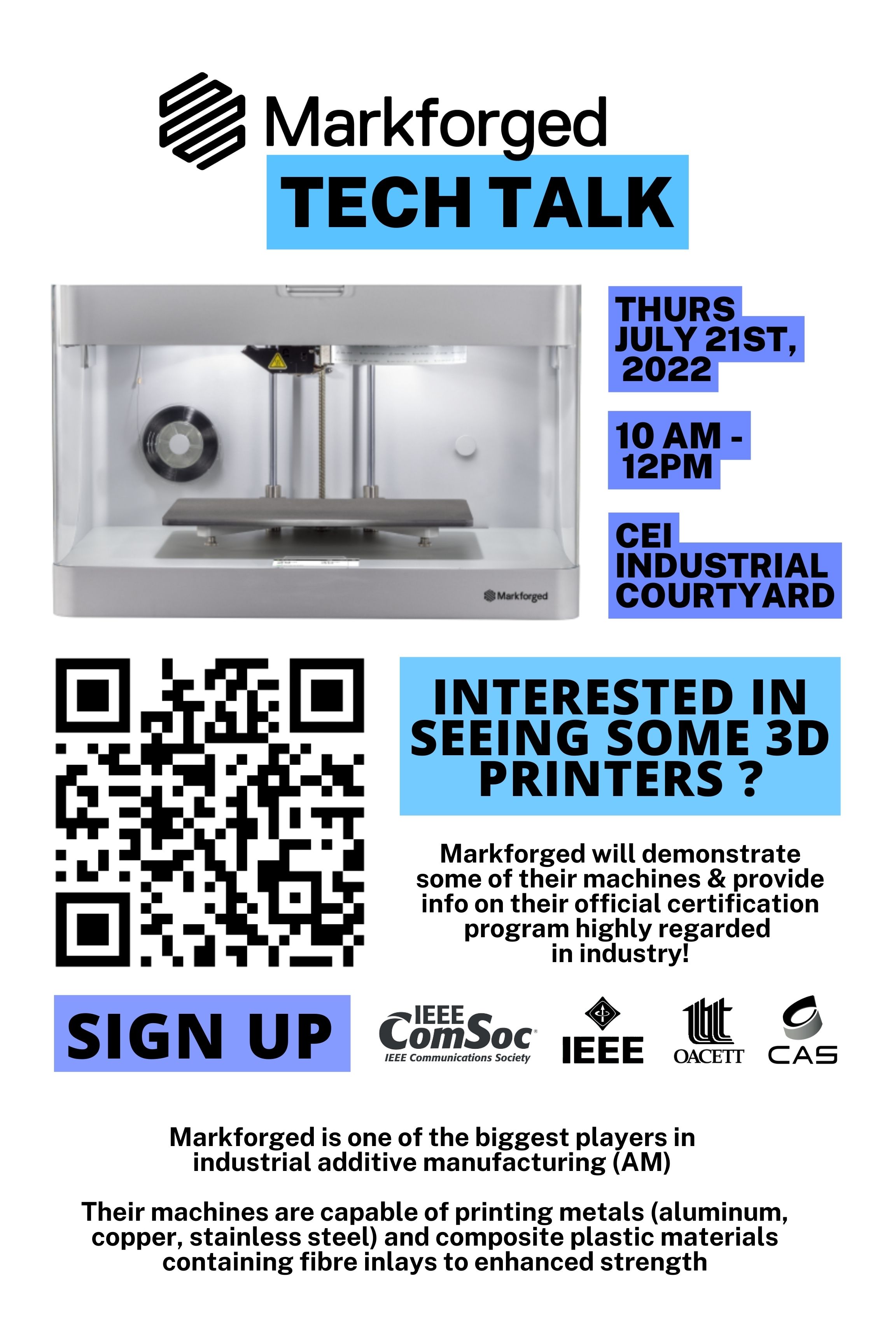 Please join us in the courtyard for a tech talk where Markforged will demonstrate some of their cutting-edge technology and provide information on their official certification program highly regarded in industry.