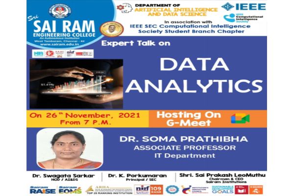 The IEEE SB & AI&DS department organized an Expert Talk on Data Analytics 26 November 2021 for all the students of Sri Sairam Engineering College in online mode.