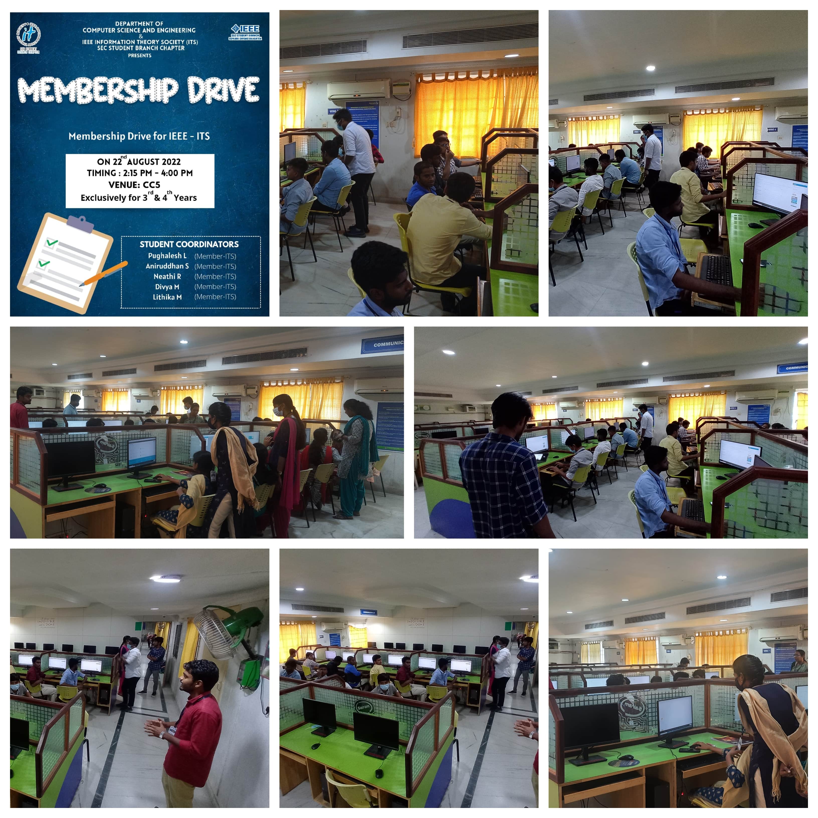 On 22nd August 2022, the IEEE Information Theory Society SEC Student Branch Chapter conducted a membership drive called “Membership-Drive”. The drive commenced at 02:15 PM and the students were given a brief introduction about IEEE ITS. Followed by that, all the students were asked to register themselves with IEEE and obtain a membership for Information Theory Society with the help of the Office Bearers and Student coordinators of the event. The drive was successfully completed at 04:00 PM.