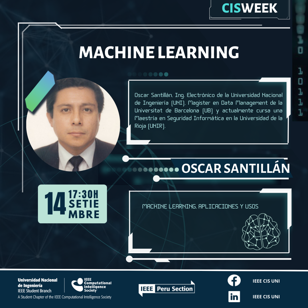 Breve resumen: El Capítulo de Inteligencia Computacional de la Universidad Nacional de Ingeniería CIS UNI tiene el agrado de invitar a los estudiantes, egresados y público en general al Webinar "Machine Learning" a cargo de Oscar Santillán, como parte de nuestro evento CISWEEK.