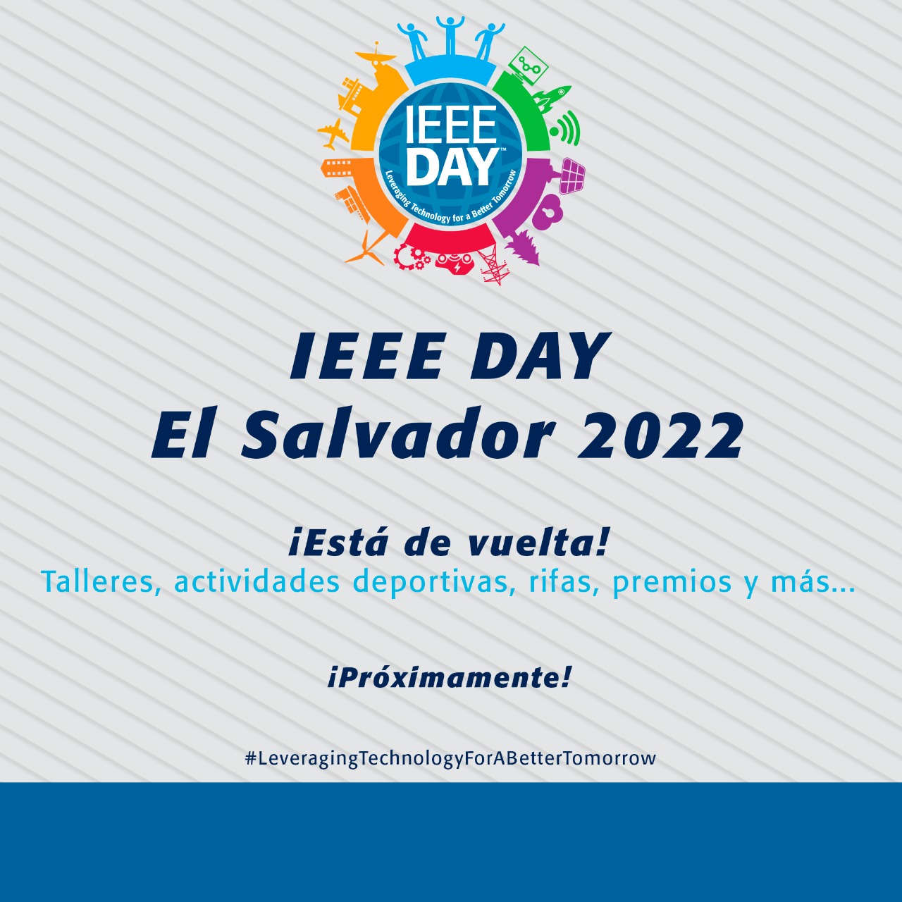 La Rama Estudiantil IEEE de la Universidad Don Bosco con el apoyo de IEEE Sección El Salvador hacen la atenta invitación a las ramas estudiantiles de El Salvador a la celebración del IEEE DAY El Salvador 2022. Tendremos el desarrollo de workshops, entrega de pines y muchas actividades más!.