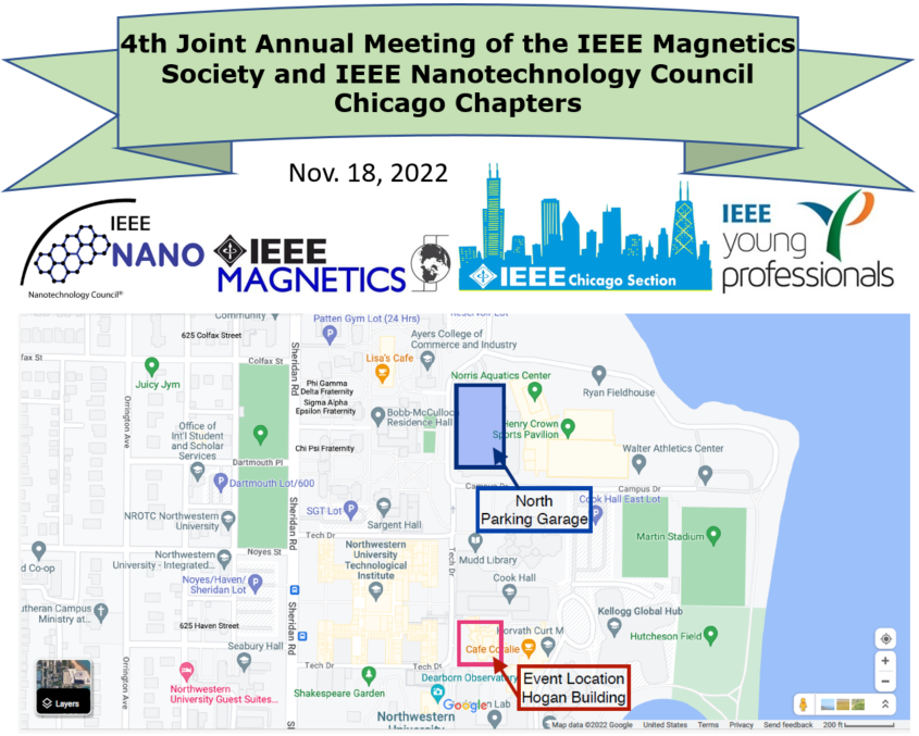 Welcome to the 4th Joint Annual Meeting of the IEEE Magnetics Society and IEEE Nanotechnology Council Chicago Chapters, to be held in a hybrid form (in-person plus on Zoom) with in-person venue at Northwestern University on Friday, November 18, 2022. The meeting will provide free breakfast & lunch and face-to-face interaction with the best local Chicago reserachers in Magnetics and Nanotechnology!