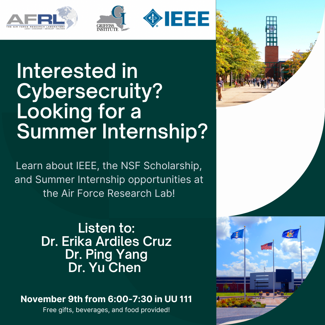 This is a special event co-hosted with the IEEE Binghamton University Student Branch. The goal is to promote the NSF Cybersecurity Scholarship and introduce the summer internship program at the U.S. Air Force Research Laboratory (AFRL). In addition, this event is open to students who are not IEEE student members to learn more about IEEE and help them to register as new members. Free gifts, pizza, and beverages are provided!