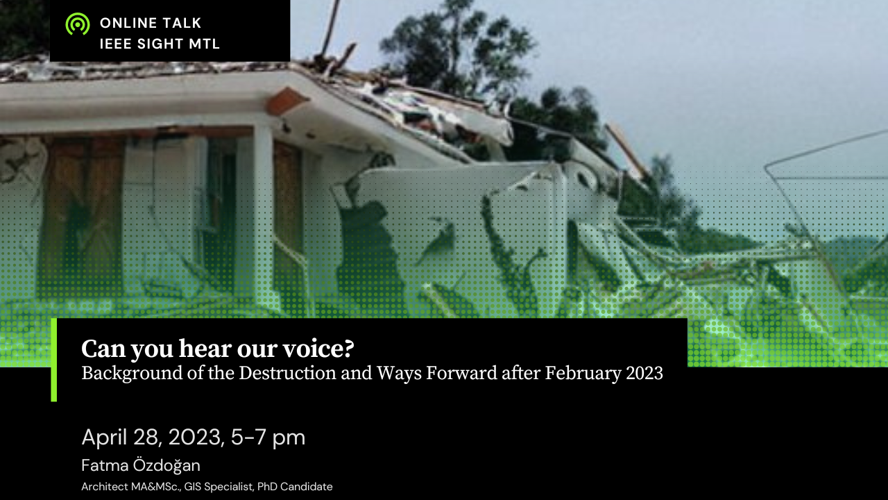 IEEE SIGHT MTL is proud to present "Can you hear our voice? Background of the Destruction and Ways Forward after February 2023 Earthquakes in Türkiye" - an insightful event featuring guest speaker Fatma Özdoğan. Join us as we explore the potential of technology in mitigating the impact of natural disasters and improving our ability to respond to them.