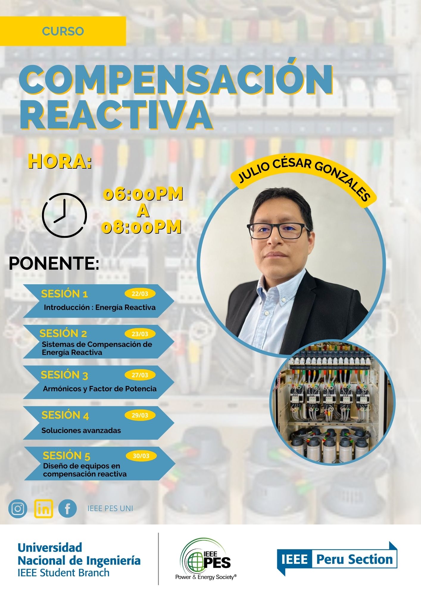 El Capítulo de Potencia y Energía de la Universidad Nacional de Ingeniería ⚡PES UNI⚡️tienen el agrado de invitar a estudiantes al Curso: “Compensación Reactiva” a cargo del ponente Julio Cesar Gonzales.