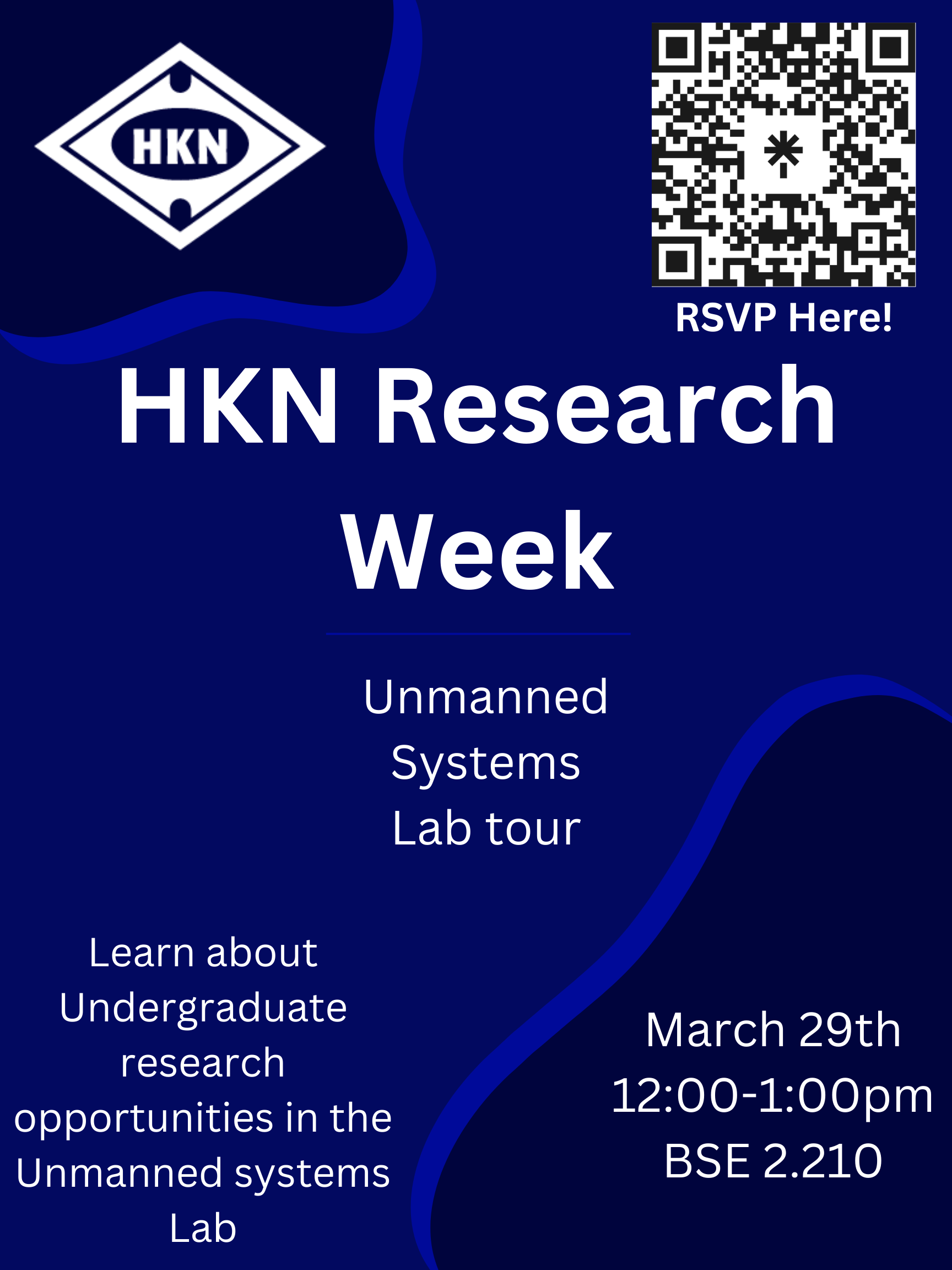 Unmanned Systems Lab Tour on March 30th at 12pm-1pm in BSE 2.210. The Unmanned Systems Lab focuses on research with Machine Learning, AI, Swarm Robots, and Autonomous systems! We are limiting this event to 20 people, so please RSVP!